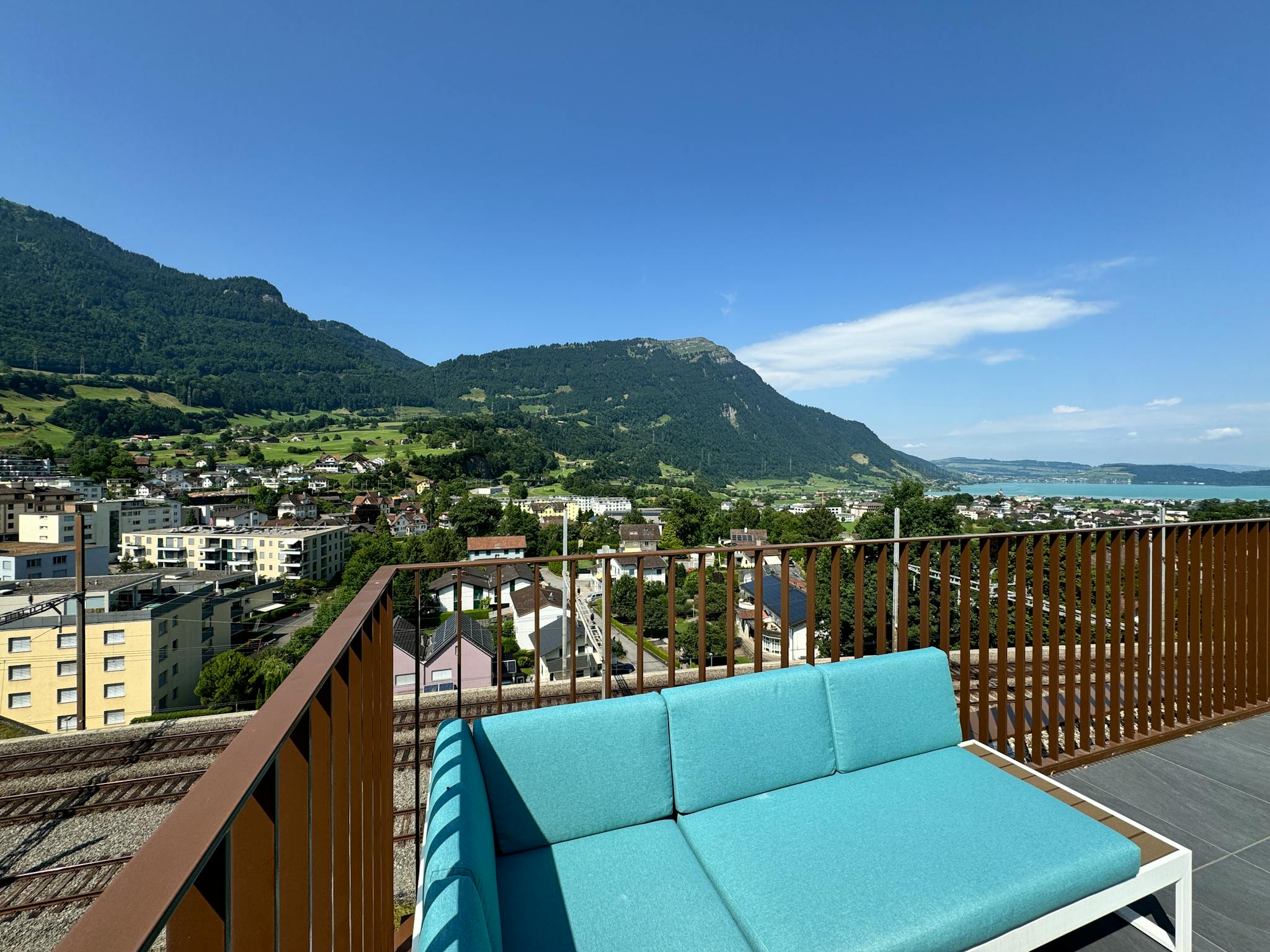 Panorama Balcony: Large private terrace with iconic views of Mt. Rigi, Rossberg, kleine & grosse Mythen, and Lake Zug.