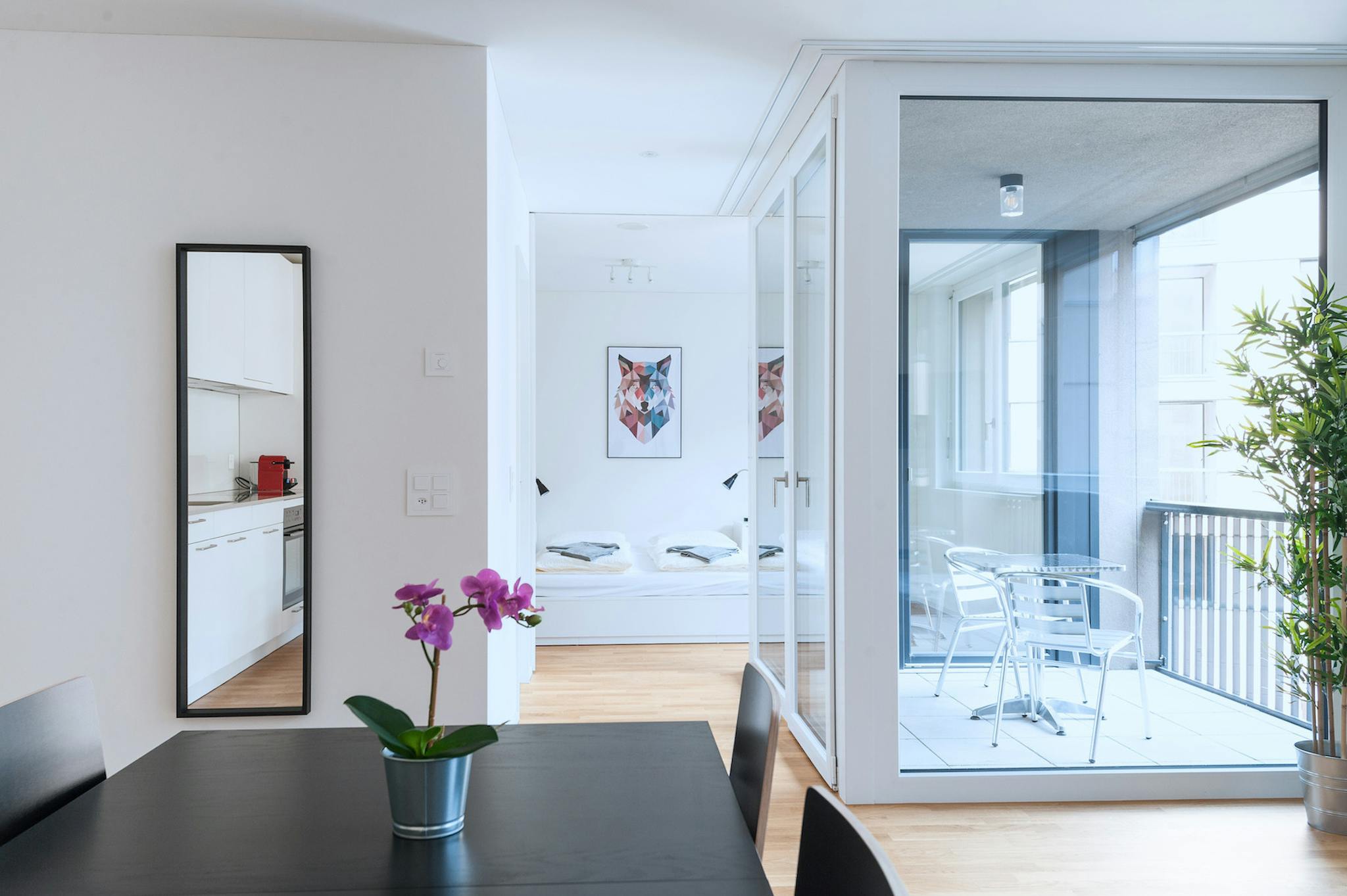 Non-SmokingNot allowedThe business apartment named "Squirrel I" covers 52m2 and can accommodate a total of two people. The apartment has 2.5 rooms consisting of a bedroom and a large living room with adjoining open kitchen. The bedroom has a double bed and a wardrobe. The living room is equipped with a sofa and a sitting area with dining table and chairs. The kitchen is equipped with crockery, cutlery, pans, hotplates, refrigerator, microwave, dishwasher and coffee machine. In the bathroom, you will find a WC, shower, hairdryer and various toiletries. The apartment also has a private balcony where you can relax and enjoy the sun on beautiful days.