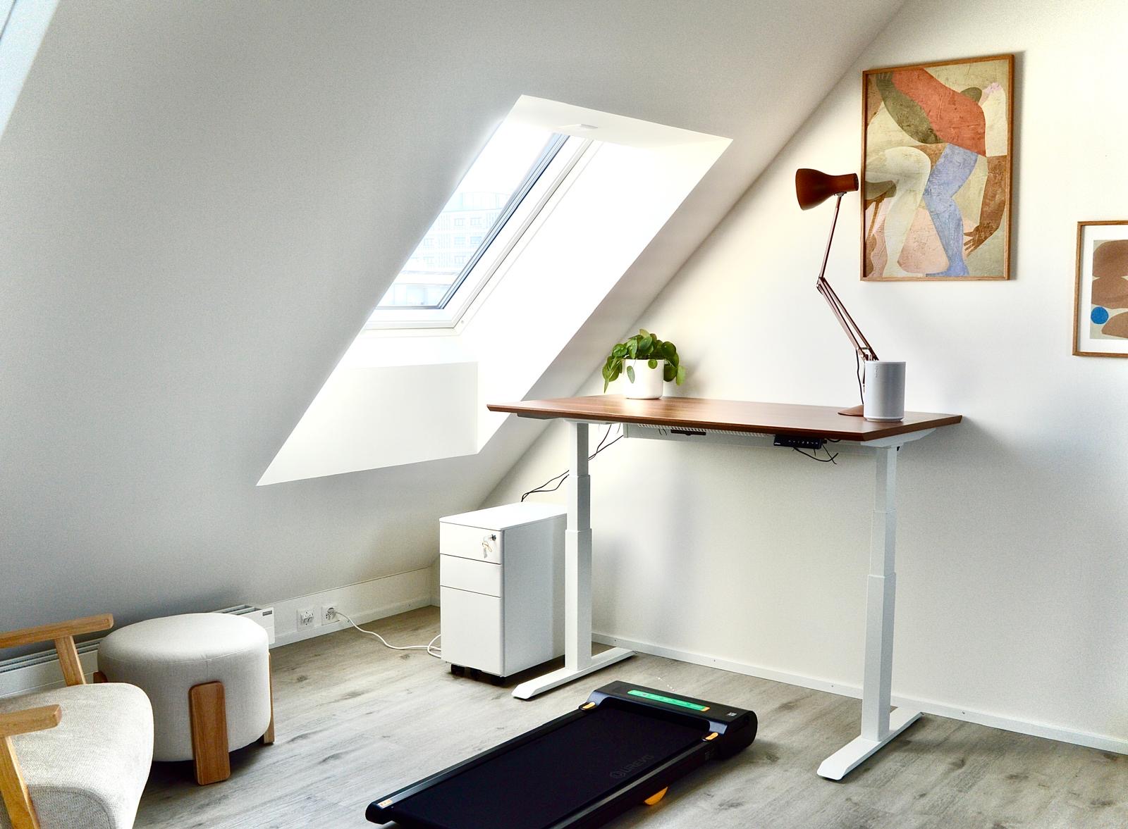 • Ergonomic home office setup with a height-adjustable desk, supportive chair, and optimal lighting to promote healthy posture and productivity