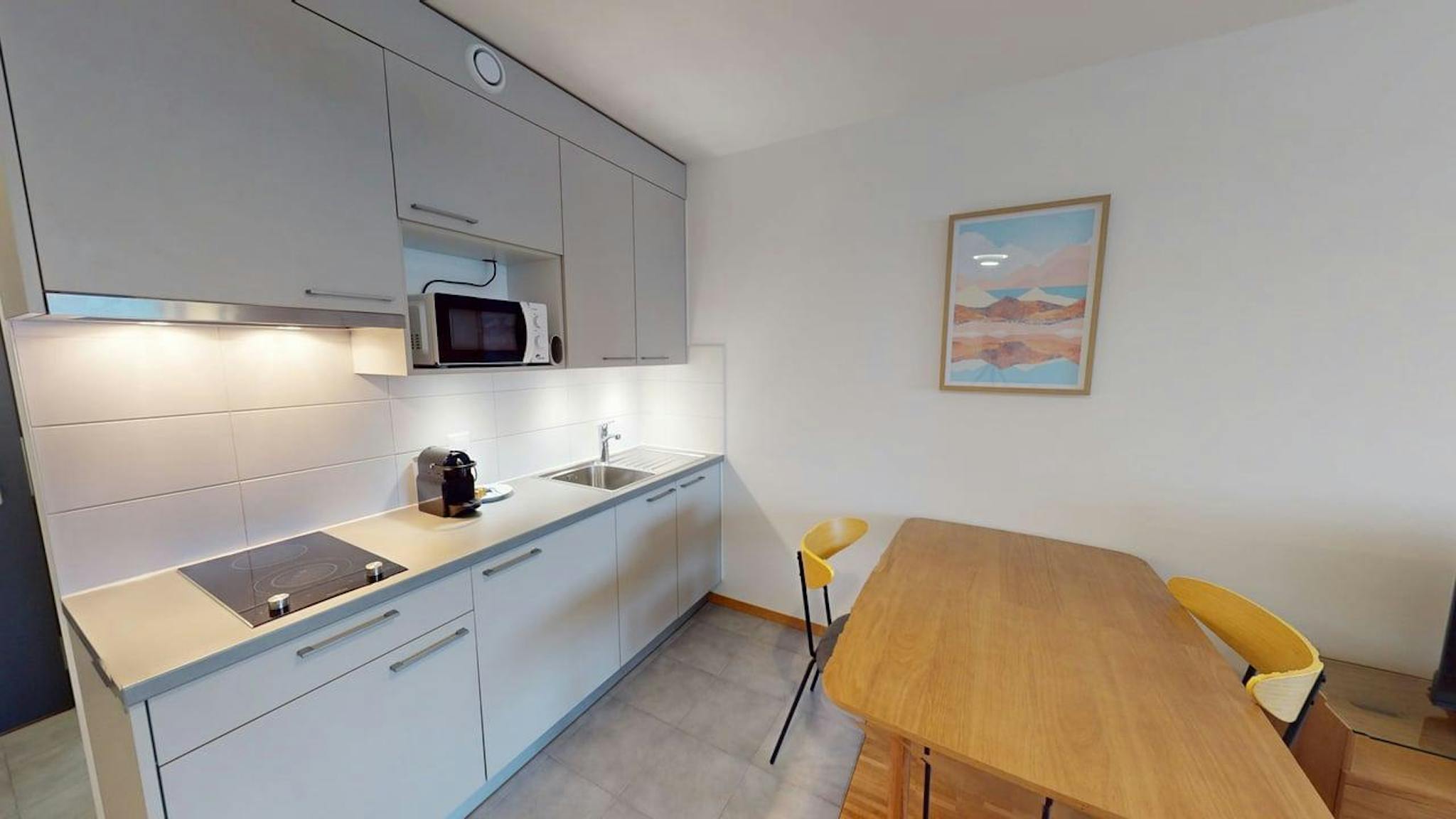 It features an equipped kitchen with hob, microwave and fridge, as well as a TV, high-speed Wi-Fi and a dedicated desk area.
