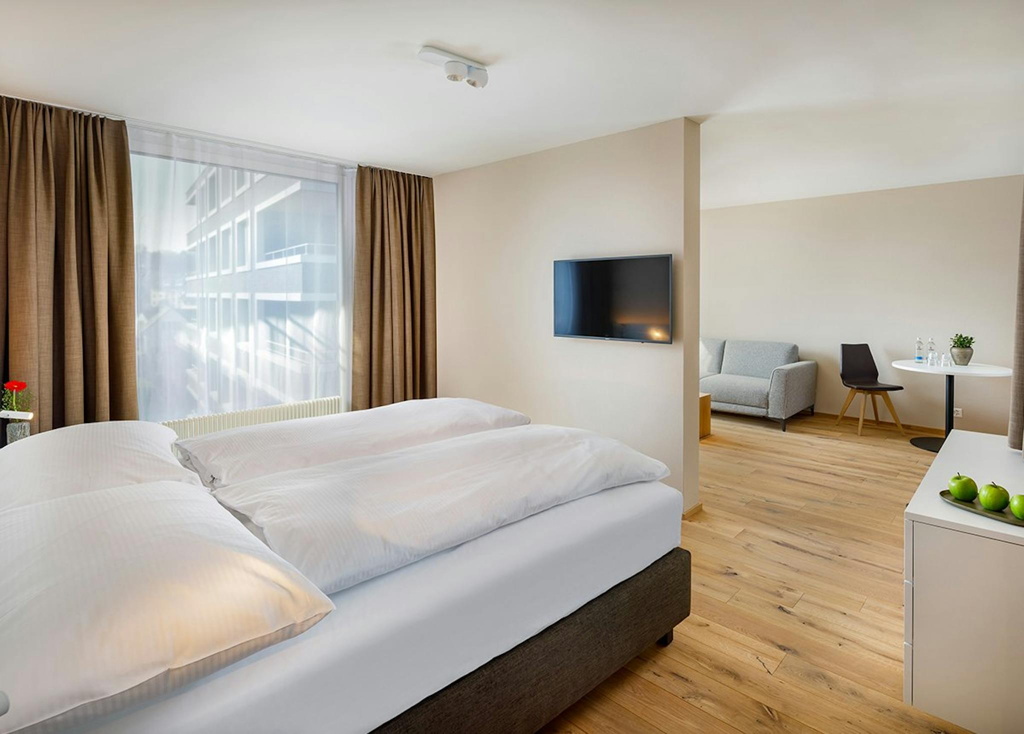 The welcome homes Apartments in the Swiss Urban style have a divided living and sleeping area. For anyone that likes to cook, the modern and spacious kitchen with adjoining eating and living areas is a true joy. A small balcony is available for that necessary urban feel and especially in the warmer seasons.
