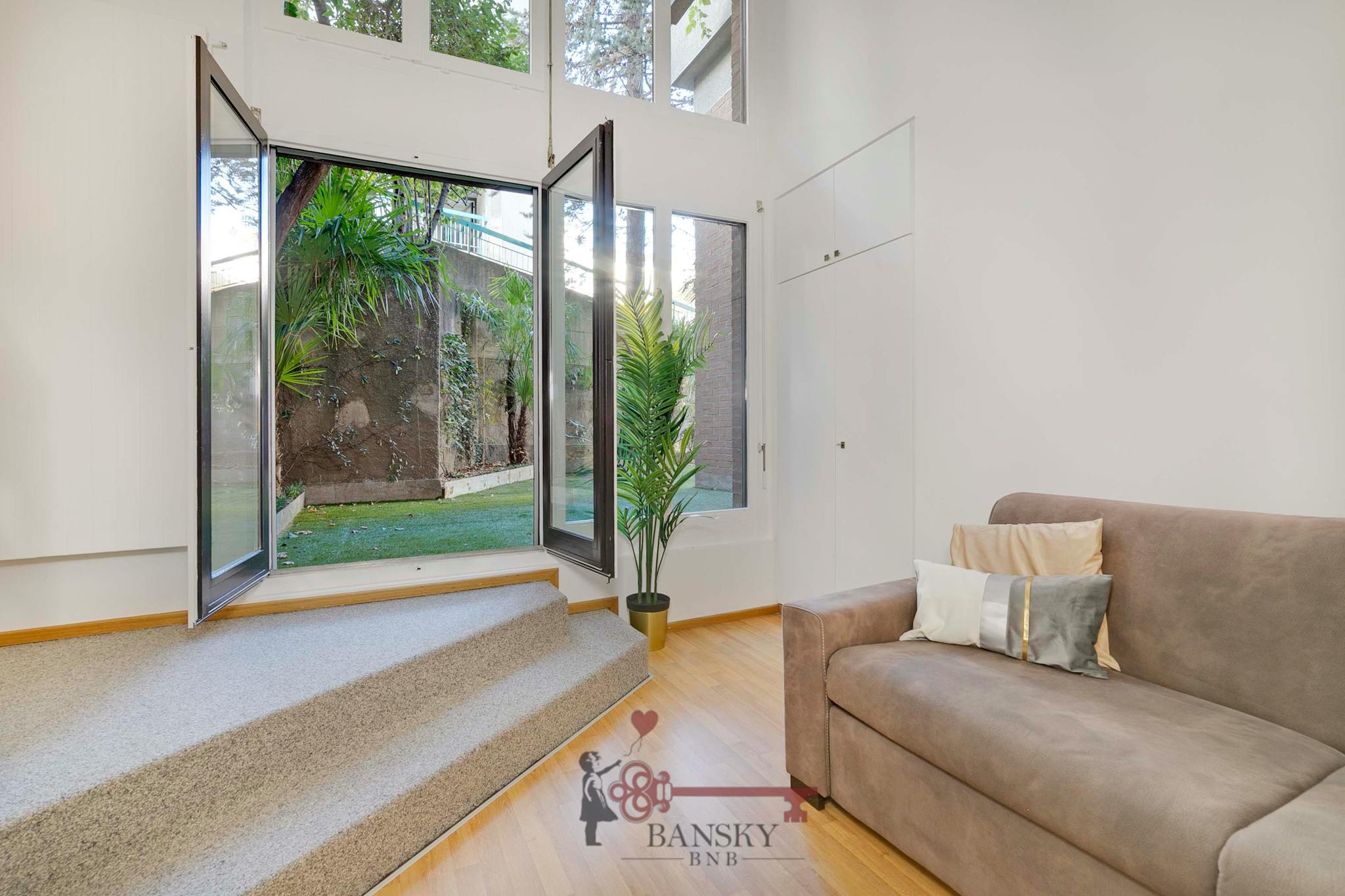 Going down the internal stairs, you reach the open space, with an exit to the private garden.