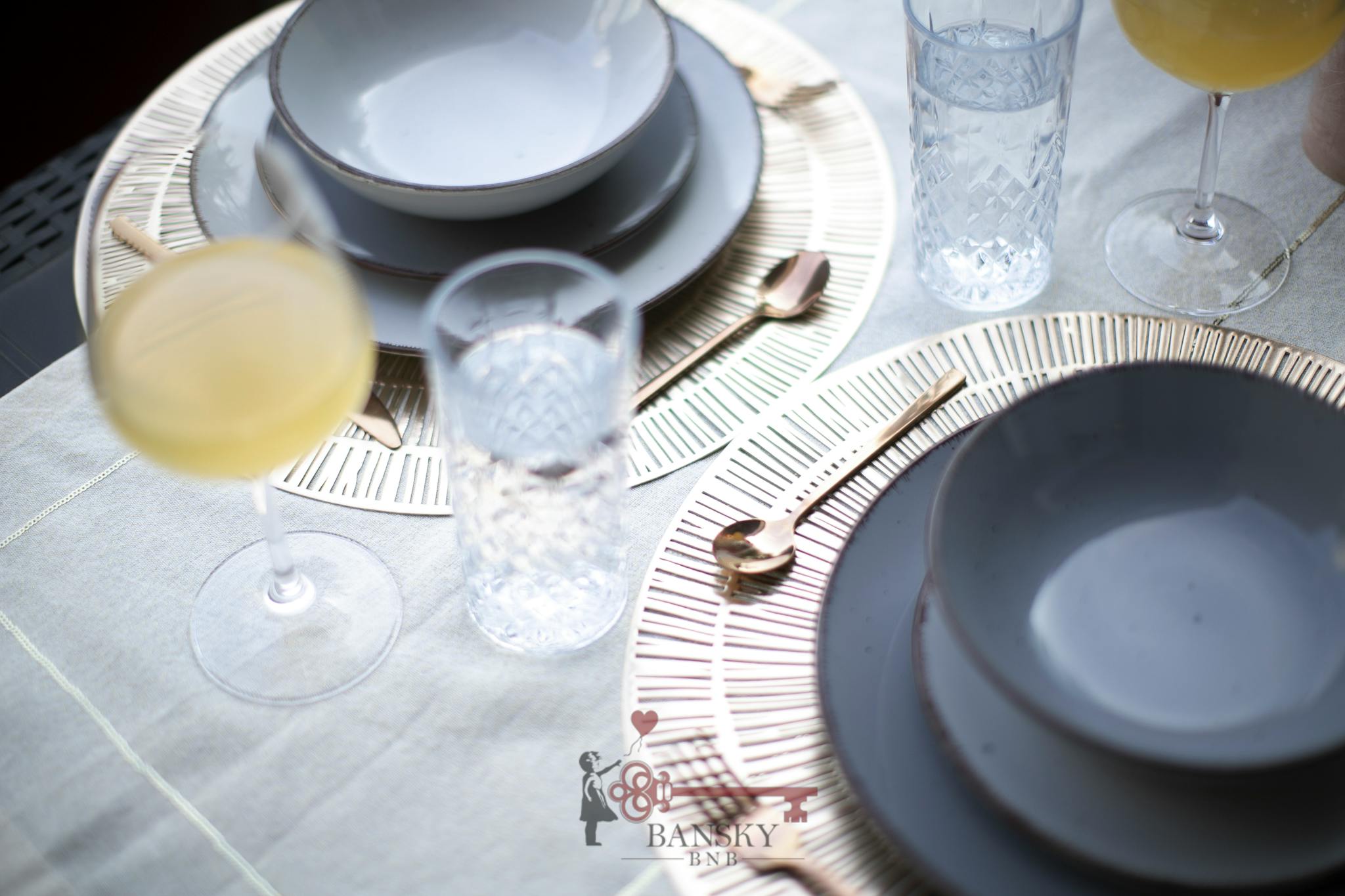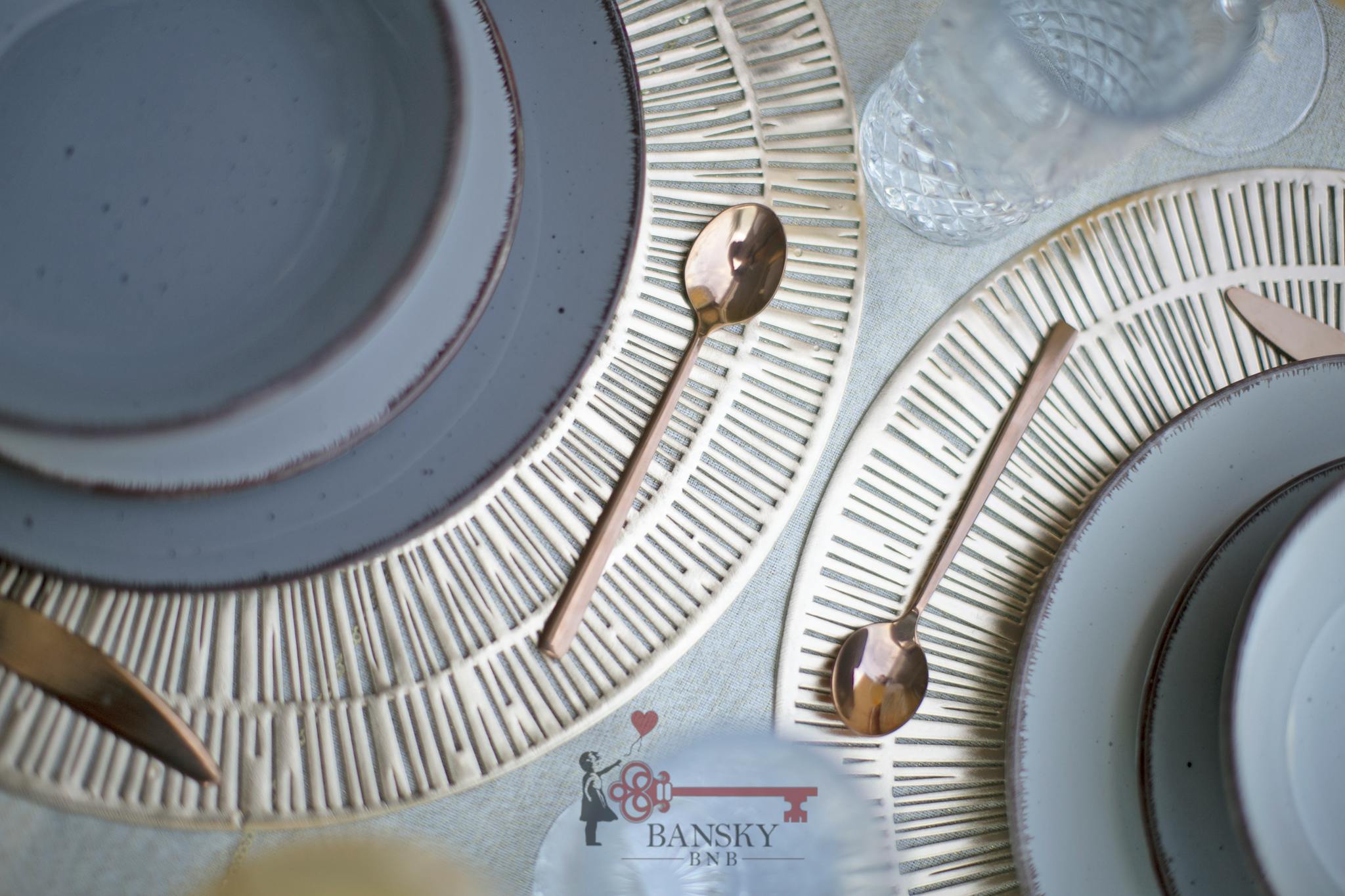 We have thought of every little detail, there are the pink gold dishes, the meat knives, the bread knife, the cutting board, the potato peeler and the corkscrew, the bowl, several ladles, pots and pans for cooking.