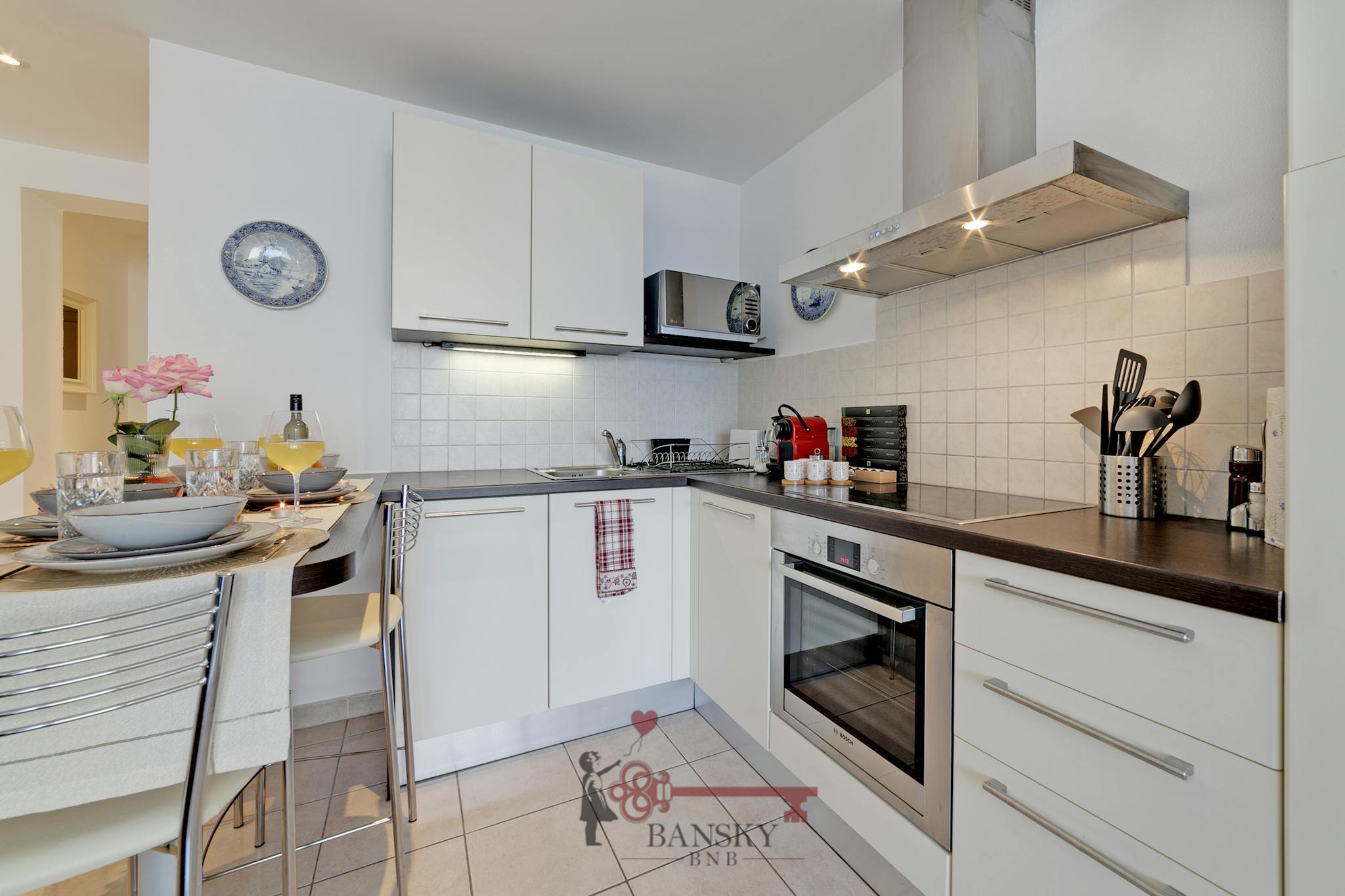 You'll also find a kettle, toaster, microwave, and a Nespresso machine that makes great coffee.