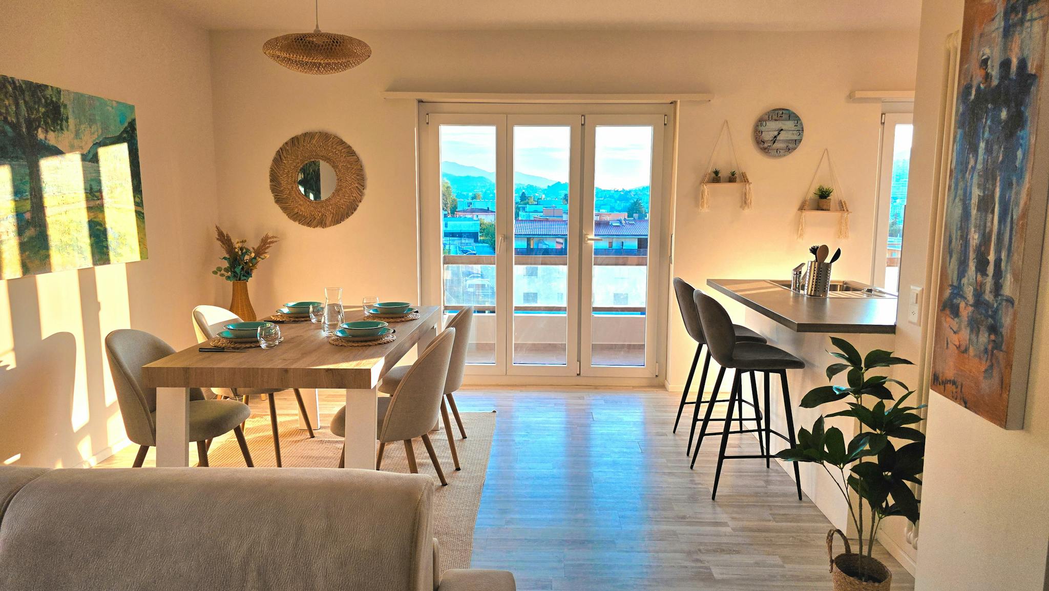 Ampia zona giorno: Luminoso soggiorno con zona pranzo, arredato con divano letto, tavolo in legno e sedie imbottite, televisore a schermo piatto, impreziosito da piante decorative e una splendida vista panoramica