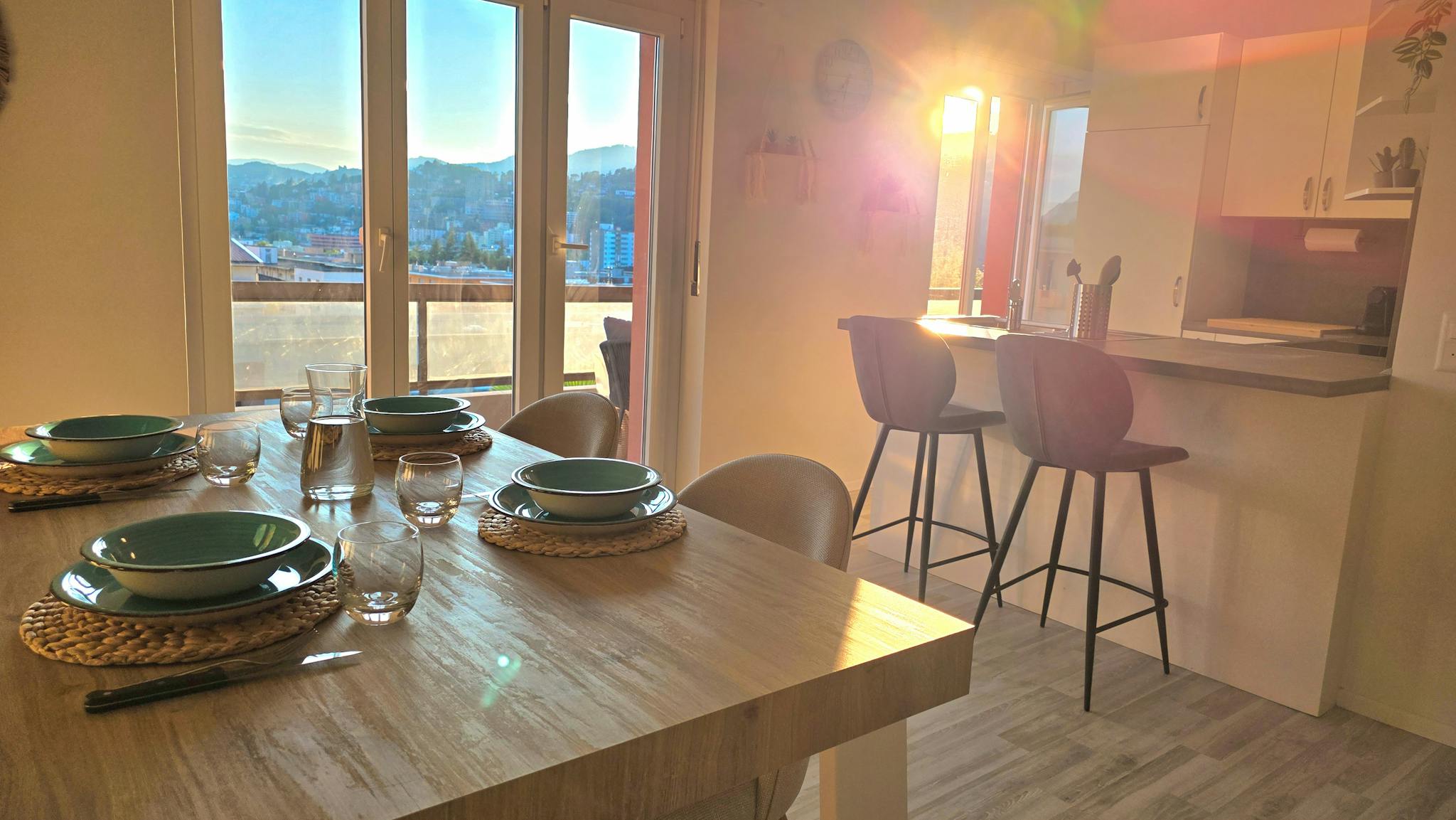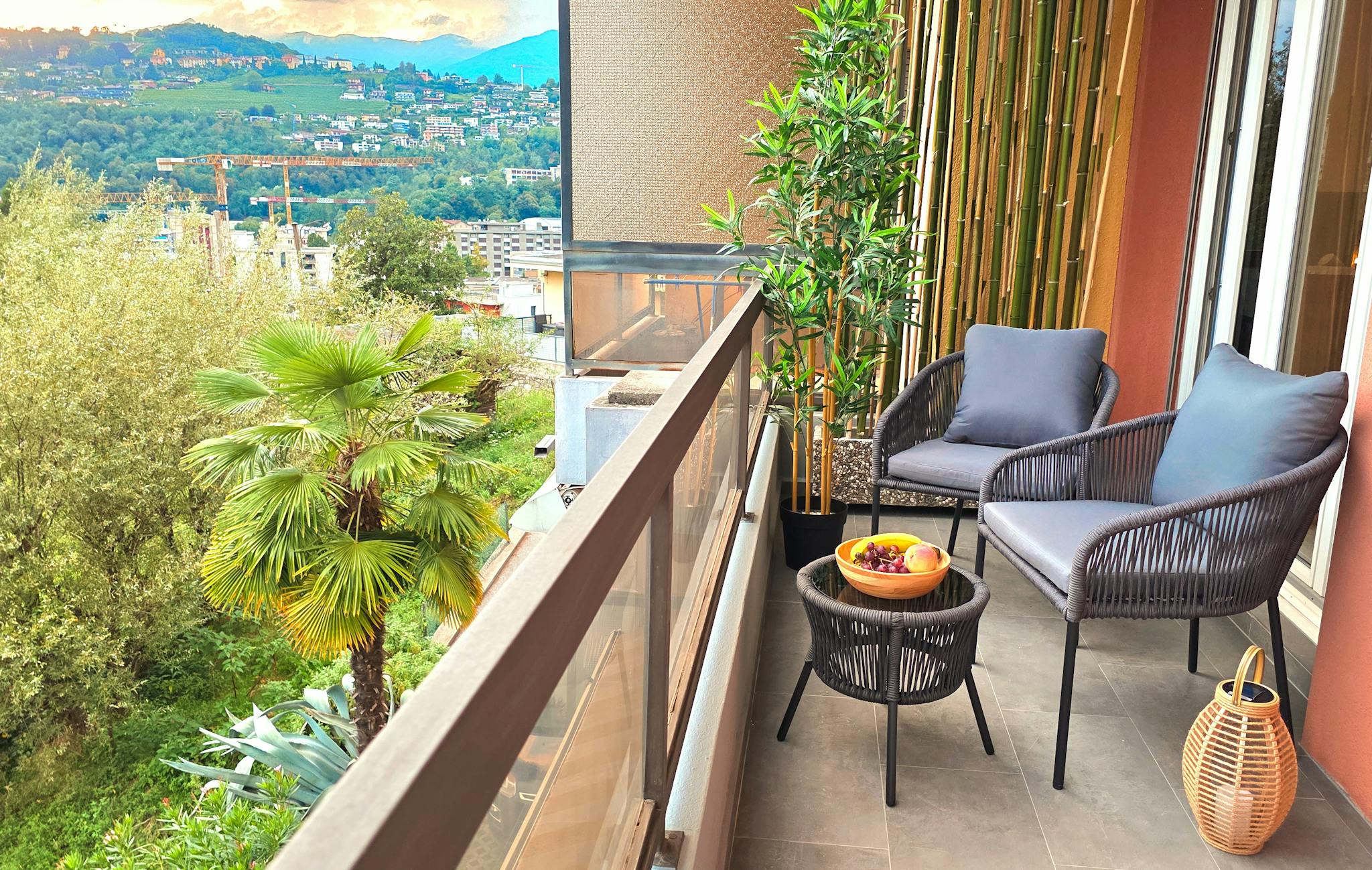 Balcone panoramico: Ampia terrazza con ringhiera in vetro, arredata con sedie lounge, tavolino e piante, che offre una vista mozzafiato sulle montagne e sulla città