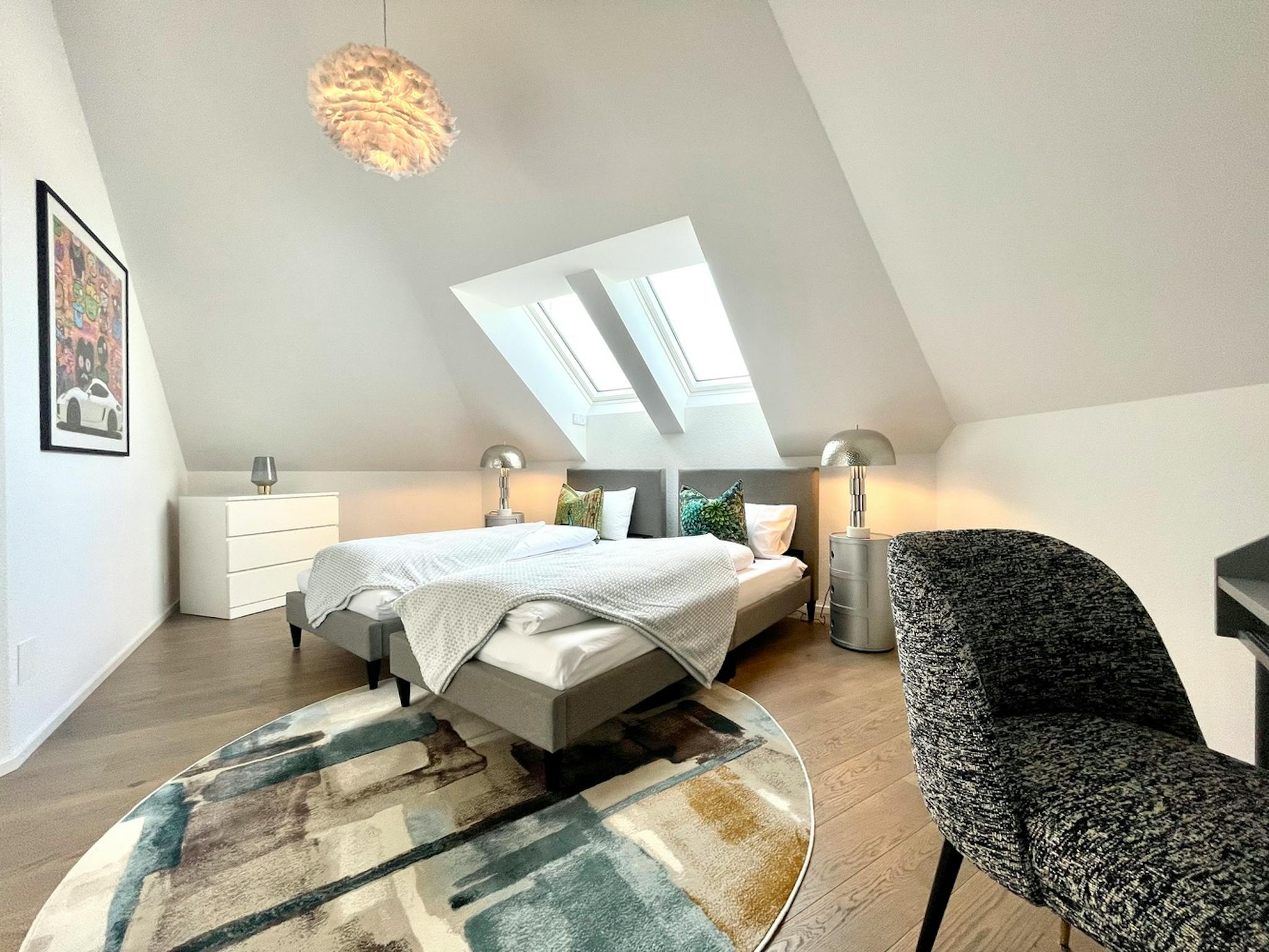 An elevator accesses the apartment directly on the sixth floor. The apartment features high ceilings and ample natural light through the many windows with incredible views of the Uetliberg and charming Wiedikon on a total of 115 sqm. The living room and kitchen with dining area is separated by a super cozy loggia terrace. Since this is the highest apartment in the property, you almost have the impression that you live in your own house. In total there are two spacious bedrooms and two bathrooms (1 en-suite from the master bedroom). The master bedroom has a king size bed, while the second bedroom has been furnished with two single beds. Home office and homeschooling? No problem; office desks in each room are also provided. The icing on the cake in this exceptional apartment is exquisite artwork from the past and the modern era – artwork by British artists and photographs by renowned photographers will put you in the mood for enjoying your new home.