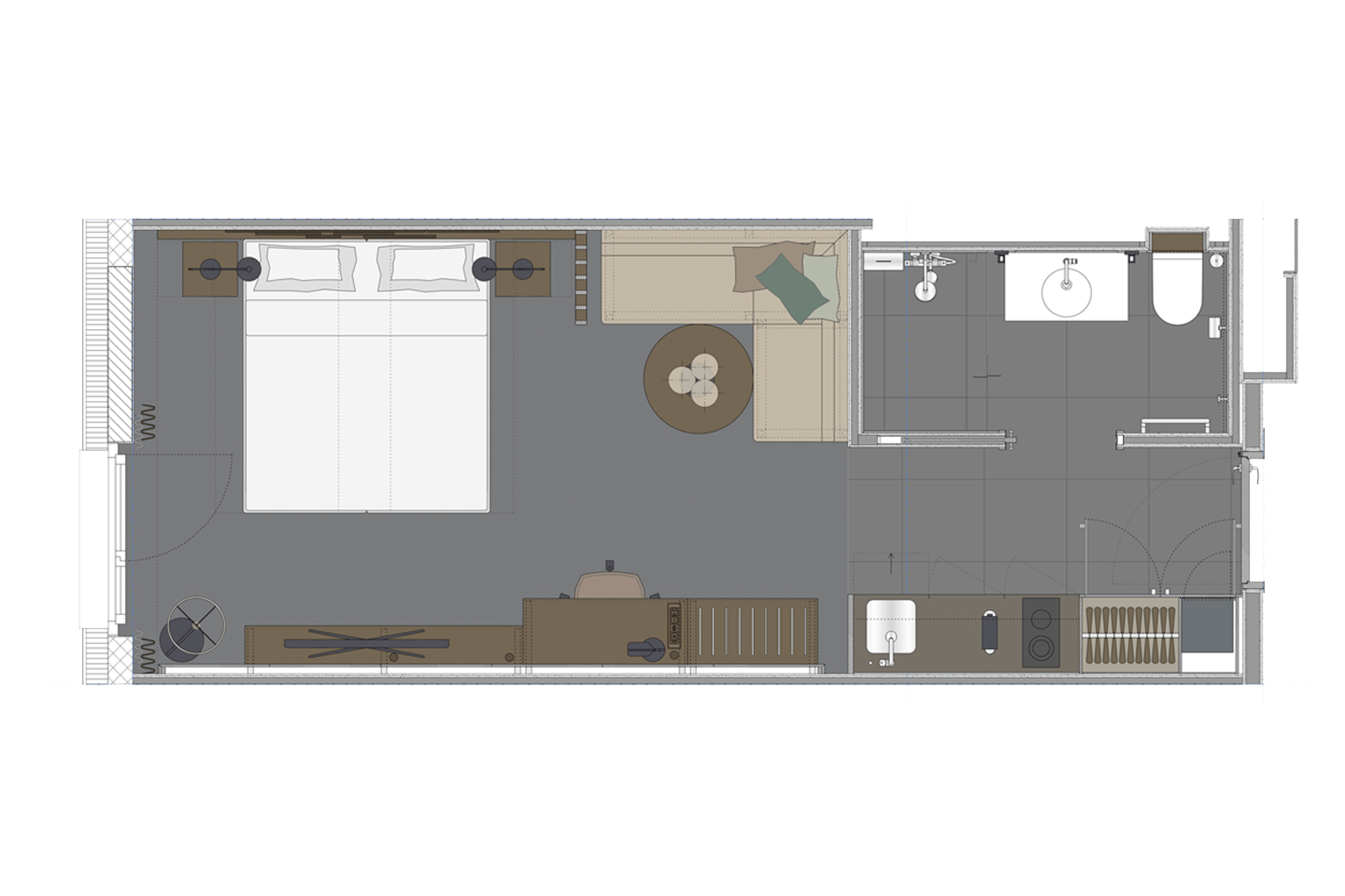 The 28 sqm studio (hidden) have a fully equipped kitchenette with a refrigerator, freezer, microwave, and stove with two hobs. A dining area, flat screen TV and a walk-in rain shower are also part of the standard layout of the suite.