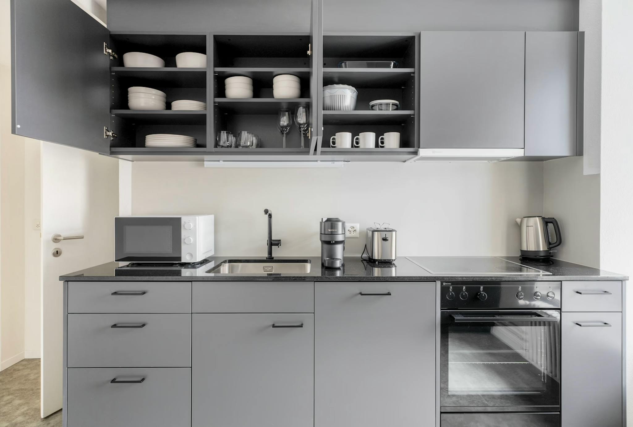Sleek Kitchen: Featuring grey cabinets, black countertops, and high-end stainless steel appliances including a built-in oven, microwave, coffee maker, and dishwasher.