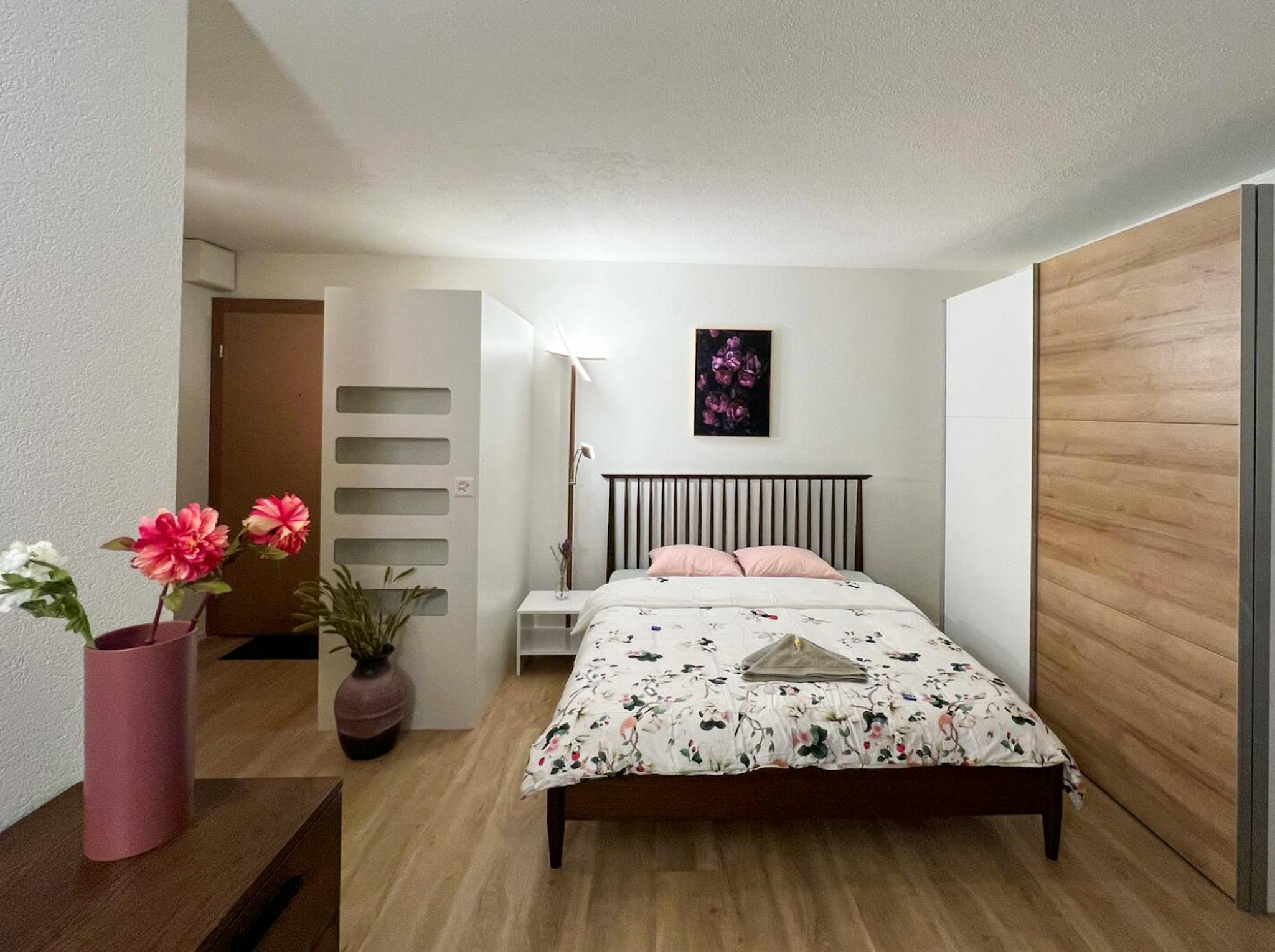 Double bed with wardrobe, bed covers & pillows