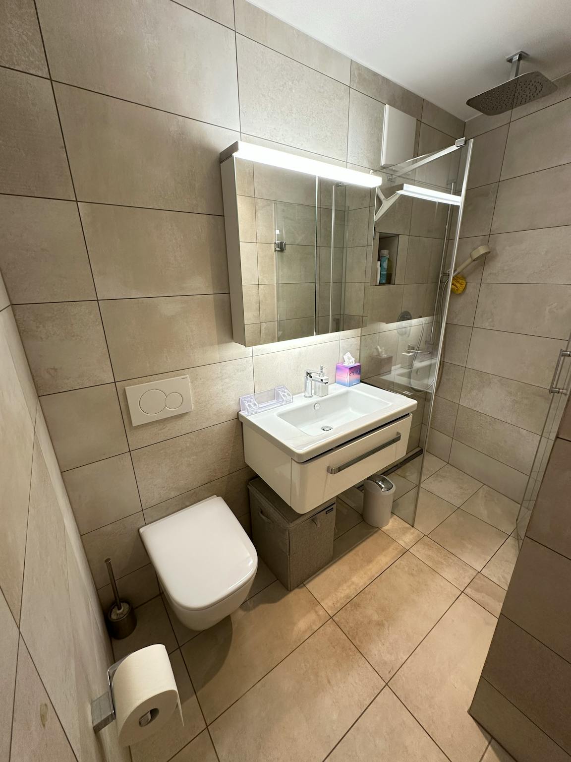 Bathroom: Fully renovated with stone-effect tiles, a walk-in rain shower, and a floating vanity with a backlit mirrored cabinet.