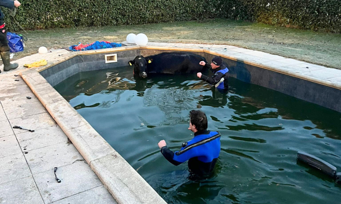 When one resident awoke the morning after the night before, he must have assumed that he was still drunk, as sitting in the middle of his swimming pool was one of the cows. A quick call later, the emergency services arrived to help the stricken animal.